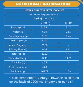 Tasting Notes: The Jowar Millet Butter Cookies offer a delightful crunch with a rich, buttery flavor. The subtle nuttiness of jowar millet complements the creamy, buttery texture, creating a well-balanced, slightly sweet cookie. The cookies are not overly sweet, making them perfect for pairing with tea or coffee, or enjoying as a standalone snack.