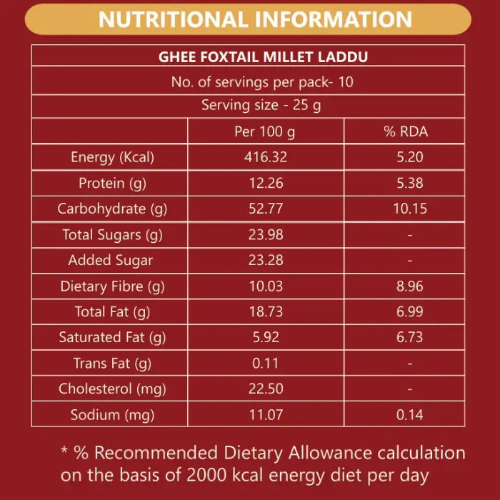 Tasting Notes: The Ghee Foxtail Millet Laddu boasts a soft, melt-in-your-mouth texture with a rich, nutty flavor from foxtail millet. The warmth of pure ghee enhances the sweetness naturally, while the millet provides a slightly earthy undertone, creating a well-rounded and satisfying treat. Each bite delivers a taste of traditional sweetness with wholesome goodness.