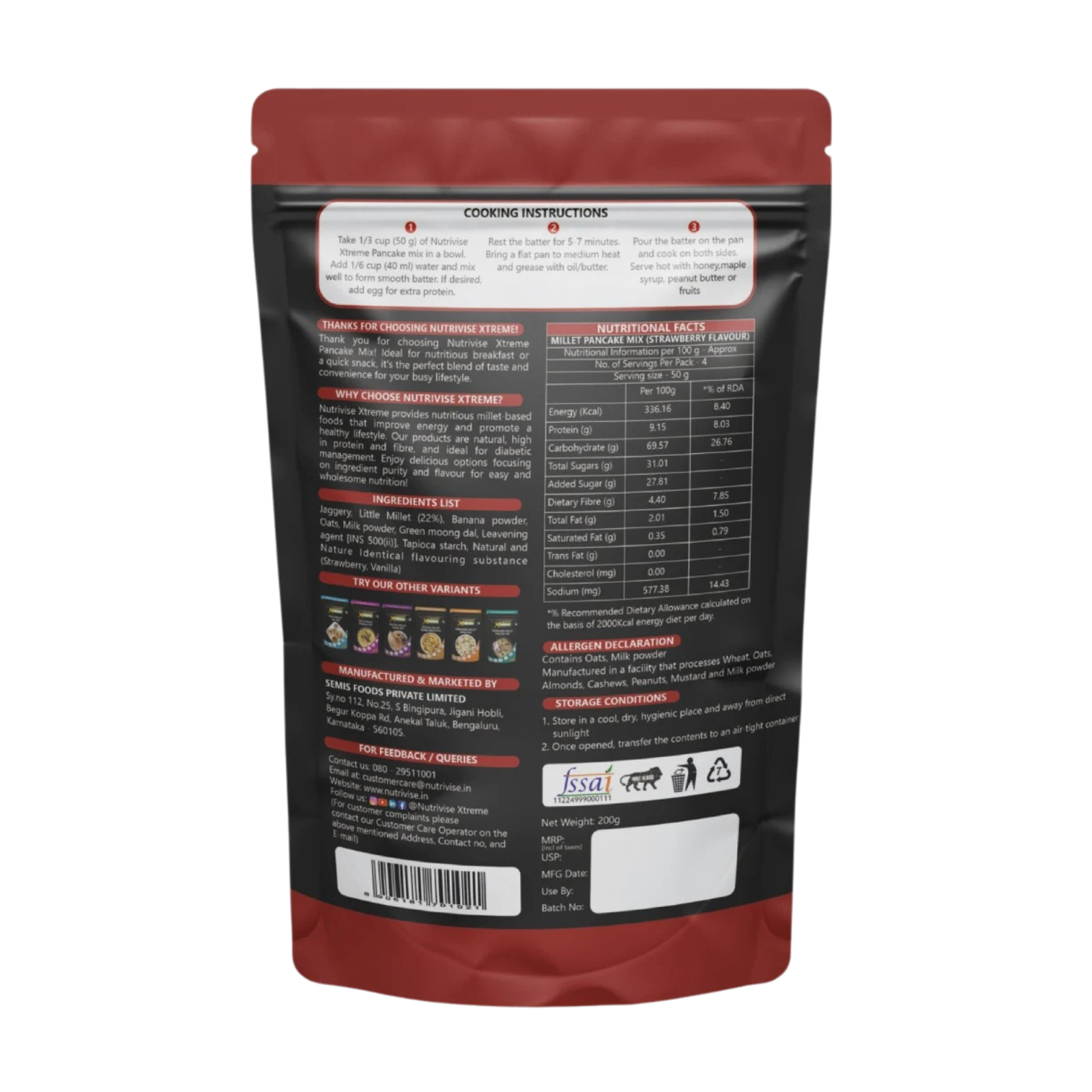 With its base of millet, a powerhouse of fiber and essential minerals, Nutrivise Xtreme Millet Pancake Mix supports better digestion and sustained energy. Jaggery provides natural sweetness without refined sugar, while the strawberry flavor adds antioxidants, making every bite as nutritious as it is delicious.